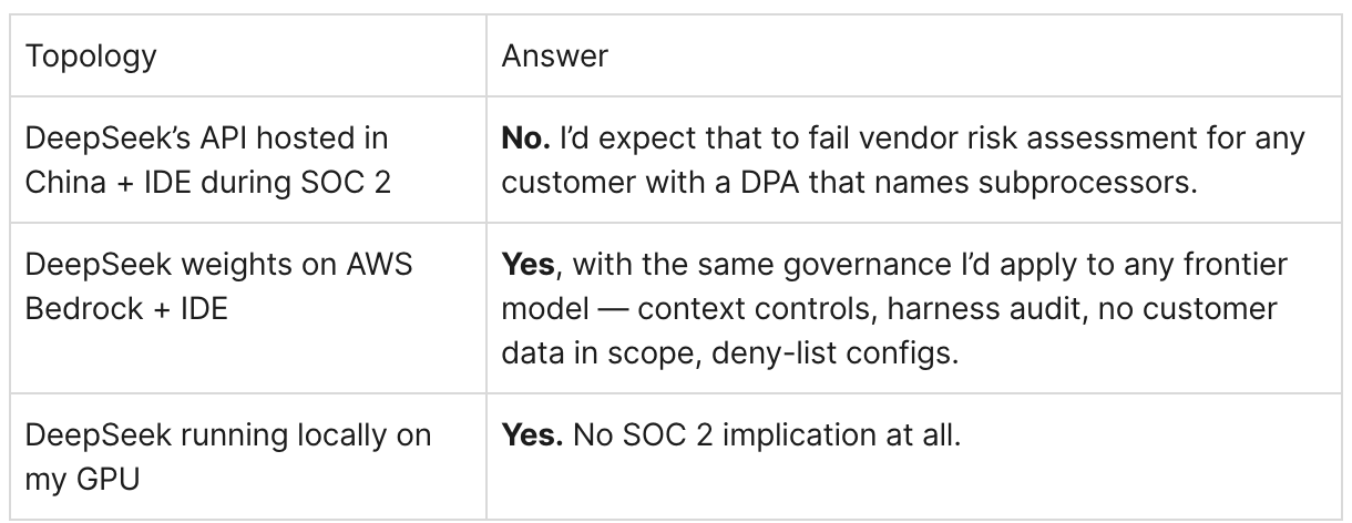 Auditors don’t care that DeepSeek was trained in Hangzhou any more than they care that Llama was trained on Meta’s TPUs. SOC 2 focuses on where customer data flows when it’s used, not on where the model came from.