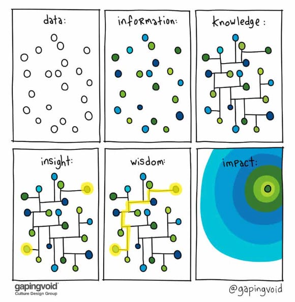 AI shortcuts this process in a profound way. It’s like having 24x7 access to the smartest people across every field imaginable. LLMs can do the heavy lifting of connecting the dots in ways that can help us get to more of those Eureka moments. It’s the perfect embodiment of the data, information, knowledge, insight, wisdom, impact meme below.