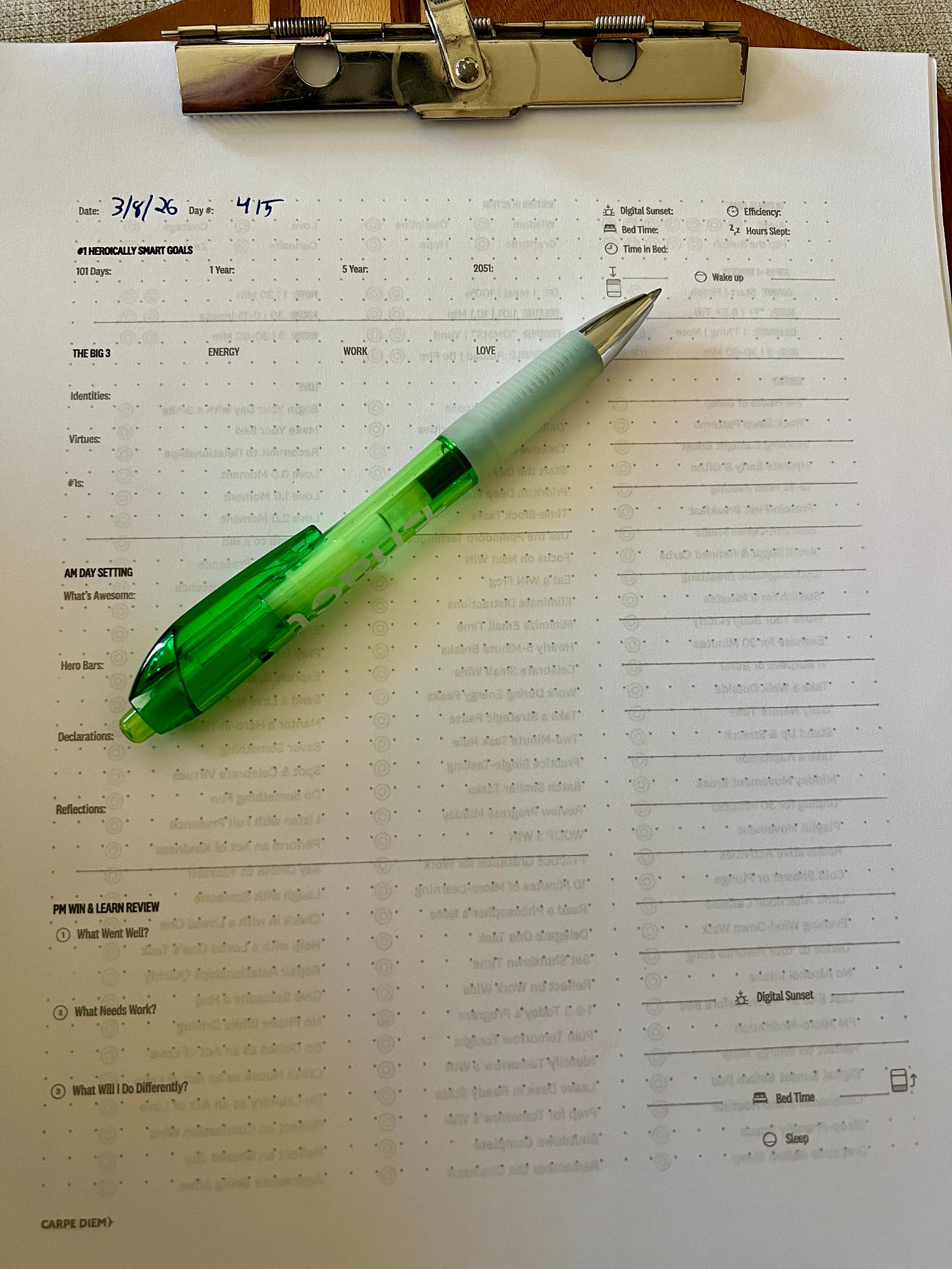 In 2024, I shared how I joined a 101 day boot camp called Heroic Elite. The premise was simple. Fill out a daily Carpe Diem page that defines everything from your big goals to your daily targets. Review your results at the middle and end of the day. Never skip a day.